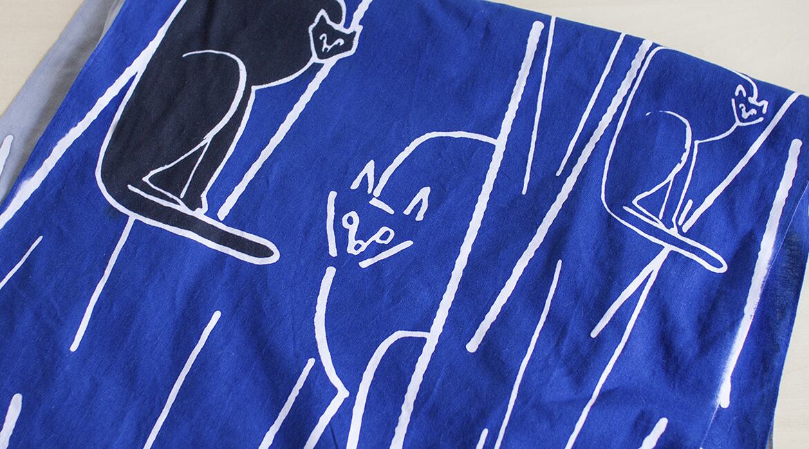 この手ぬぐいを初めて見たとき、不思議な魅力を感じました。デザイナーの「はしもとなおこ」さんにお話を伺ったところ、テーマは野良ネコとのこと!